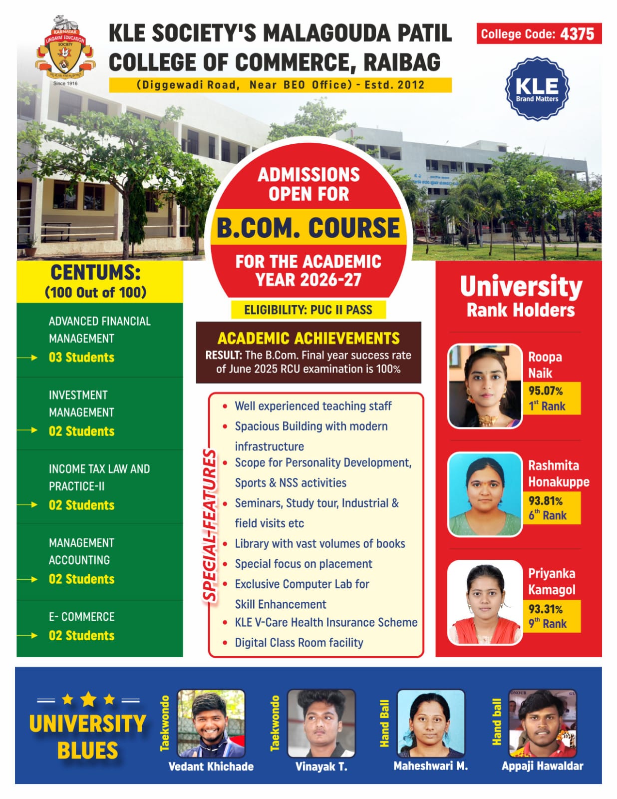 KLE’S Malagouda Patil College of Commerce, Raibag, a center for excellent learning was founded in the year 2012 with a vision to impart education towards excellence with a holistic combination of values and traditions in pursuit of knowledge and wisdom for the upliftment of the individual and the society. Our college is located in educationally…